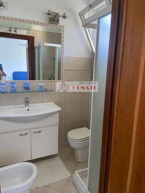 Primo piano: ampia camera matrimoniale con grande finestra vista mare, camerina con letto a castello con balconcino vista mare, bagno finestrato con doccia e camera matrimoniale con bagno interno con doccia.Piano seminterrato finestrato: una camera doppia con bagno interno con doccia, una camera doppia, un bagno e ripostiglio.